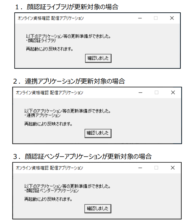 《 資格確認端末のバージョンアップ用資材がダウンロードされているか確認する方法 》 ① 資格確認端末のデスクトップにある「配信アプリケーション管理ツール」をダブルクリックし起動します。 ② 「配信実績の確認」をクリックします。 ③ 表示されたファイルの顔認証ライブラリのバージョンを確認します。 顔認証ライブラリのバージョンが【 5.1.0 】の場合、バージョンアップ用資材がダウンロードされている、 あるいはバージョンアップが完了している状態です。 ※ダウンロードされていましたら、資格確認端末の再起動によりアップデートを完了させてください。